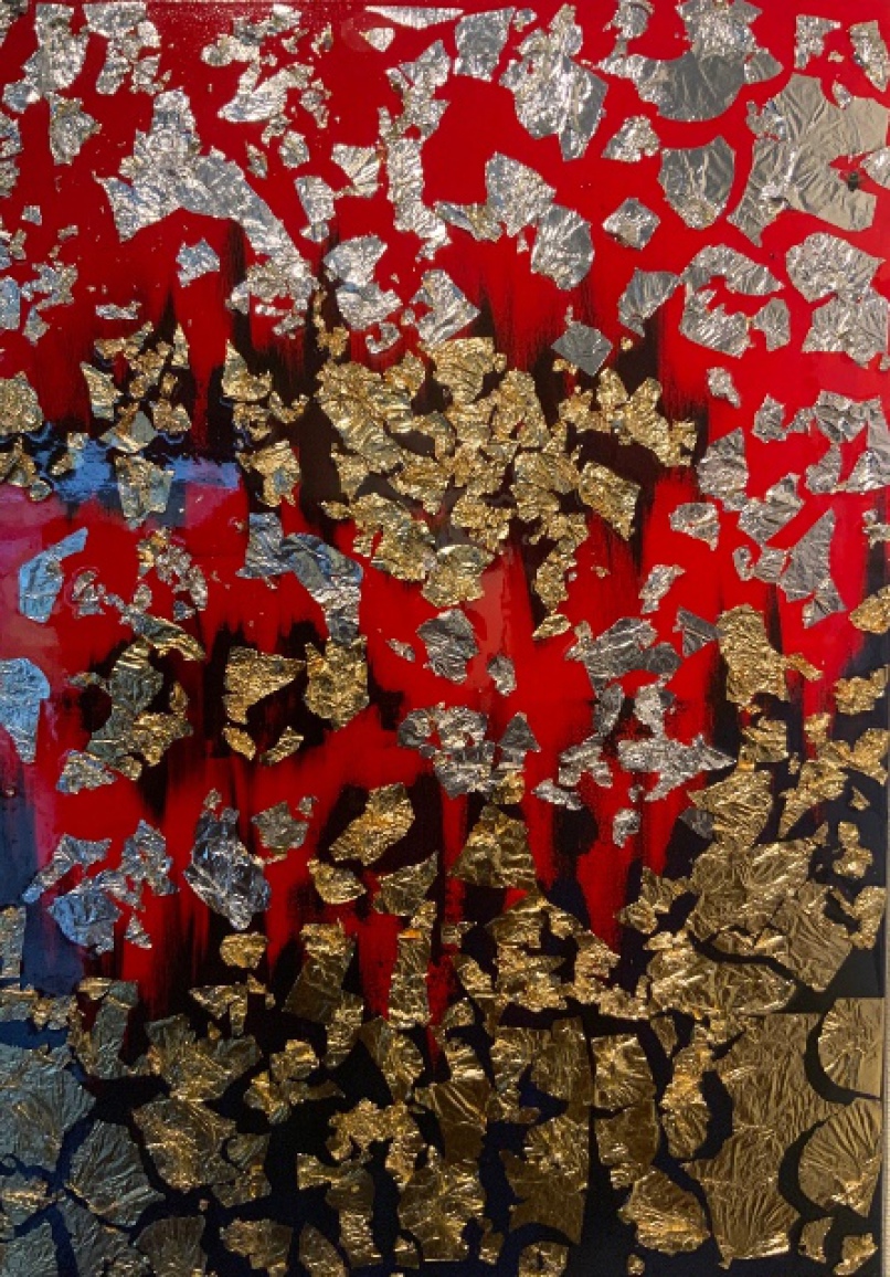 1. Es wird eine Leinwand mit Acrylfarbe grundiert, auf der im zweiten Schritt Resin (also Epoxidharz) aufgetragen und in dann